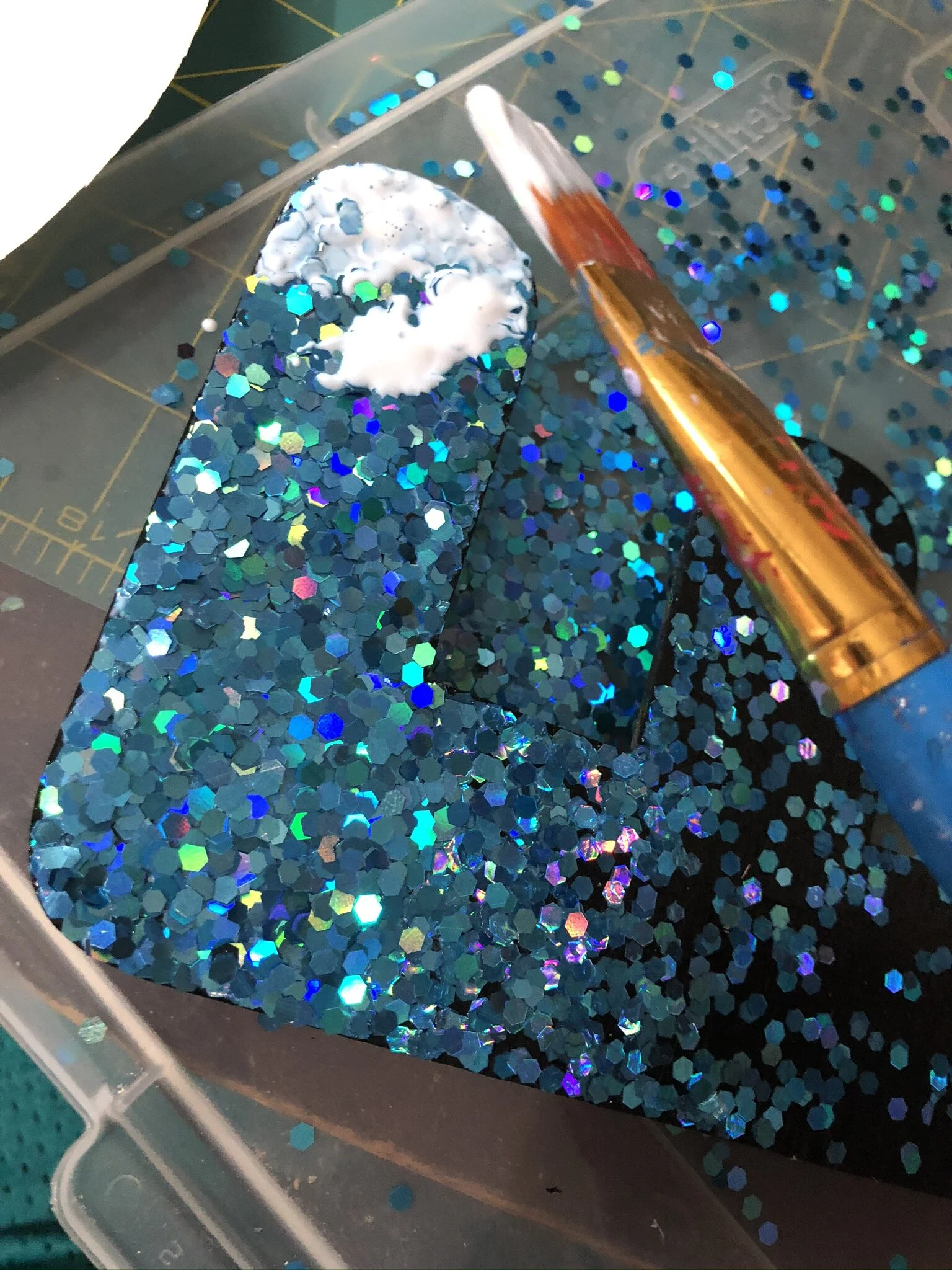 • My favorite step of any glitter project is pouring the glitter! This took some finesse though. I went to town with the glitter at the very top where I knew it needed to be solid, and then lifted the letter up to let the glitter “fall” down the letter and help with the ombre look.