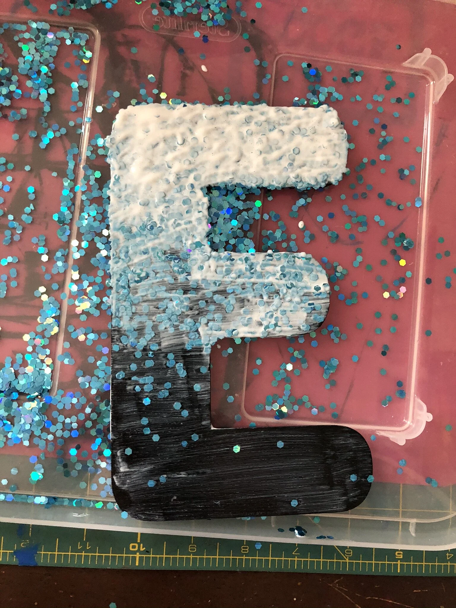 • I let the letter dry. On a couple of the other letters, I went ahead and did another layer of glitter on the top of the letter (the solid part) while the Mod Podge was still wet from the first layer, but I found that it didn’t make a different aesthetically if I did it that way, and it also made the letter take a lot longer to dry completely.